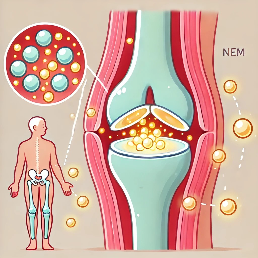 NEM에 들어있는 천연 성분들이 염증을 줄이는 데 효과 있을 수 있음.