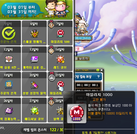 캐시샵에서 캐시아이템 구입시 일정량의 마일리지가 적립됩니다. 또한 데일리 기프트를 통해 마일리지를 얻을 수 있는데요, MVP등급이 전혀 없다는 가정하에, 한달에 마일리지를 총 1500 얻을 수 있네요. 별거 아니지만 가끔 필요할 때 마일리지를 획득하게 되면 쏠쏠합니다.
