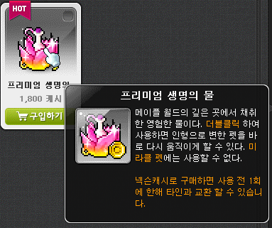 또한 프리미엄 생명의 물, 펜던트 슬롯 늘리기, 버프 프리저는 메이플스토리 게임을 즐기다보면 주기적으로 필요한 아이템인데, 이것들은 100% 마일리지로 구입할 수 있습니다. 따라서 캐시를 쓰지 않고 꾸준히 마일리지를 모으신다면 이런 유용한 아이템들을 꾸준히 살 수 있습니다.