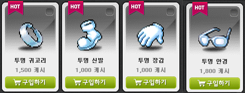 각종 코디 아이템들도 100% 마일리지로 구입이 가능한데, 대표적으로 투명셋이 있습니다. 메이플 캐릭터 코디의 기본은 깔끔한 것인데 요즘에는 키우는 캐릭터가 많다보니 마일리지 쓸일이 정말 많아졌습니다. 이외에도 전액 마일리지로 구입 가능한 리커버리 실드 등 캐시샵에 다양한 아이템들이 많으니 구입하시기 전, 마일리지로 구입이 가능한 아이템인지 한번 보시고 구입하시는것도 좋아요! 오늘 포스팅도 읽어주셔서 감사합니다.