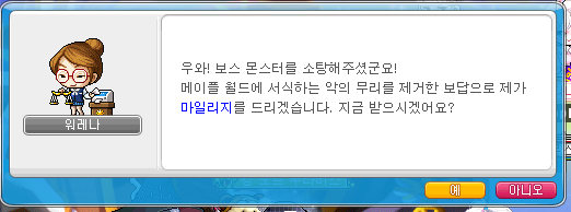 메이플 스토리에는 마일리지를 주는 보스몬스터들이 있는데, 매일매일 클리어가 가능해 보스를 클리어하고 마일리지를 수급할 수 있습니다. 대표적으로 자쿰, 힐라, 혼테일, 매그너스, 파풀라투스, 카웅, 피에르, 반반, 블러디 퀸, 벨룸, 아카이럼, 핑크빈, 시그너스가 있는데요 난이도 차이 없이 처리한 이후 화면 좌측의 마일리지 혜택을 통해 워레나로부터 각각 50 마일리지씩 획득할 수 있습니다. 하지만 월드내 보스당 1번이니, 다른 캐릭터로 잡아도 이미 다른 캐릭터로 보상을 받으셨다면 당일은 마일리지를 획득할 수 없습니다.