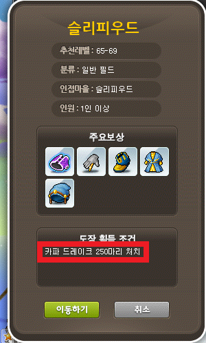 길라잡이 컨텐츠 도장을 받으면 편한 지역이 몇 군데 있는데, 대표적인 곳이 바로 슬리피우드 입니다. 슬리피우드 컨텐츠 도장을 획득하시면 레벨에 상관없이 어디서든 슬리피우드로 바로 이동이 가능한데, 슬리피우드에서 왼쪽으로 포탈을 타게 되면 여섯 갈래 길이기 때문입니다. 여섯 갈래길에 있는 디멘션 게이트를 이용하면 다른 지역으로 편하게 이동이 가능하기 때문에 카파 드레이크 250마리를 처치하셔서 컨텐츠 도장을 받아놓는 것을 추천해드립니다.