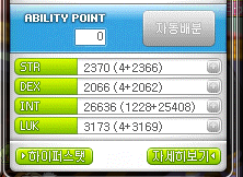 사실 스텟%와 공격력/마력의 효율은 스펙마다 다르기 때문에 완벽한 정답은 없습니다. 위 사진은 참고로 보여드릴 저의 스텟창입니다. 인트가 2만6천~7천 사이입니다. 이정도면 메린이는 아니지만, 인트 4만이상의 고자본 유저라고 할 수도 없는 정도의 스펙입니다. 제가 처음 이것에 대한 글을 읽었을 때는 고자본이 아니면 주스텟1%당 주스텟10정도라는 글을 읽고 그렇게 알고 있었습니다.