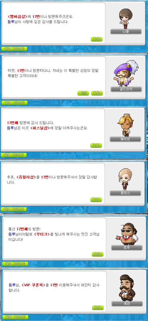 호텔 메이플 로비에 있는 NPC에게 17번씩 말을 걸어주시면 됩니다.