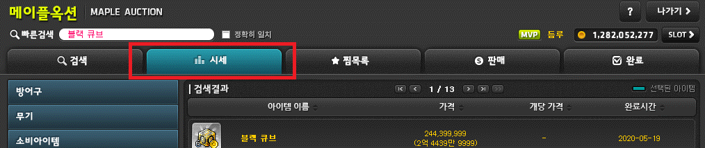 블랙큐브 6개 = 2억4천500만메소(오늘 65개 팔림)