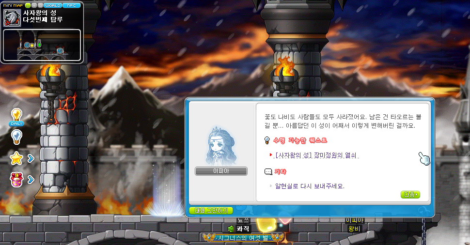 동맹의 증표도 캐슬 골렘을 처리하면 우수수 떨어질 정도로 드롭이 잘 됩니다. 시간 얼마 안걸리니, 얼른 모아서 다시 루덴에게 가주시면 됩니다. 동맹의 증표를 루덴에게 전달해주셨다면, 다시 다섯번째 탑루에 있는 이피아에게 가주시면 돼요. 이피아를 눌러 <[사자왕의 성] 희망은 있을까요>를 진행해 주시면 됩니다.