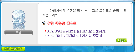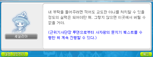 세실리아를 클릭하면 자격 증명을 하라고 하는데, 다시 네번째 탑루로 가서 루덴을 만나고 와야 합니다. 루덴을 눌러 <[사자왕의 성]사자왕의 문지기>퀘스트를 눌러 진행해주시면 되는데, 교도관 아니를 잡아오면 됩니다.