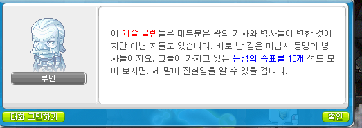 동맹의 증표도 캐슬 골렘을 처리하면 우수수 떨어질 정도로 드롭이 잘 됩니다. 시간 얼마 안걸리니, 얼른 모아서 다시 루덴에게 가주시면 됩니다. 동맹의 증표를 루덴에게 전달해주셨다면, 다시 다섯번째 탑루에 있는 이피아에게 가주시면 돼요. 이피아를 눌러 <[사자왕의 성] 희망은 있을까요>를 진행해 주시면 됩니다.