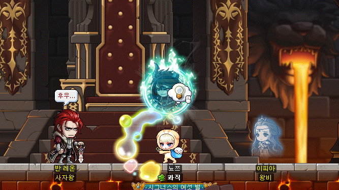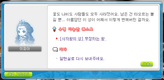다시한번 이피아를 눌러 [사자왕의 성] 부정하는 왕을 진행해 주세요. 이피아에게 말을 걸면 알현실로 보내주는데, 가운데 위치한 반 레온을 눌러서 퀘스트를 계속 진행해 주시면 됩니다. 그 이후에 알현실을 나가서 다시 이피아에게 말을 걸어주시면 됩니다.