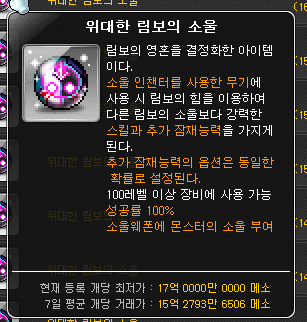 1티어 소울 중 가장 저렴한것이 8천만 메소 정도인 것에 비해, 2티어 위대한 소울은 1000만원 정도 가격대입니다.