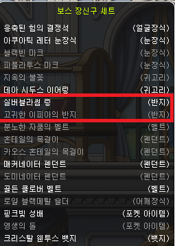 보스 장신구 세트에 보면, 실버 블라썸 링, 고귀한 이피아의 반지 모두 포함되어 있는데, 9세트 효과가 공/마 +10, 올스텟 +15, 보스 몬스터 공격 시 데미지 +10%라는 상당히 좋은 옵션이기 때문에 보스 장신구 세트를 사용하신다면 둘 중 하나는 필수로 껴주셔야 합니다.