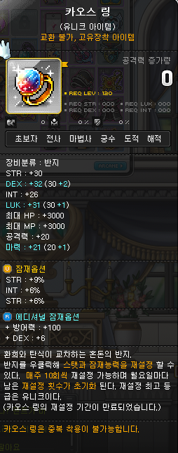다음으로 카오스링과 어드벤쳐 딥다크링이 있는데, 두 반지 모두 좋습니다. 카오스 링 같은 경우, 따로 큐브를 사용하지 않더라도 1주일에 10회씩 잠재능력과 추가옵션을 재설정 할 수 있는데 기간이 끝나기 전까지 대부분 유니크를 가더라구요. 또한 추가옵션이 공격력/마력이 최대 25까지 붙기 때문에 테네브리스링, 글로리온 슈프림 링보다는 낮지만 이벤트 링 중에서는 아주 높은 편 입니다. 기본 스텟도 30씩이나 붙어있구요.