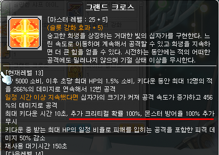 극딜기인 그랜드크로스에 방어력무시 100%, 크리티컬 확률 100%가 붙어있기 때문에 얼티링 효율이 엄청나요.