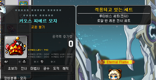 이렇게 카오스 루타비스 모자가 럭키 아이템으로 적용되기 때문에 반 레온 전사 세트와 루타비스 세트에 모두 적용되게 됩니다.