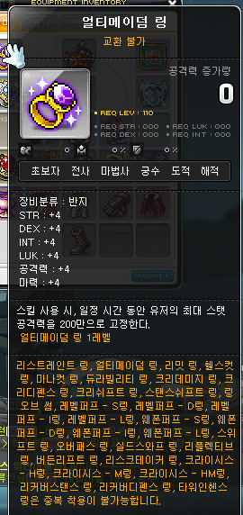 얼티메이덤 링이 바로 핵심인데요, 반지스킬을 사용했을때 스탯 공격력을 200만으로 고정한다고 나와있지만, 여기에서 데미지, 최종데미지 등 요소가 합산되어, 효율을 극대화 시킬 수 있어요.