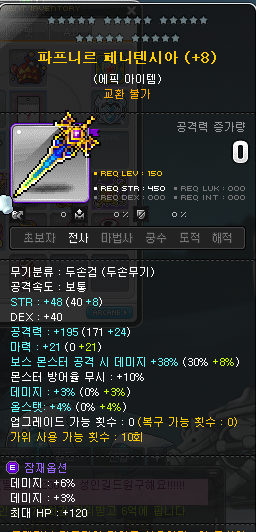 파프니르 페니텐시아를 구입하실 때 추가옵션에 보스 몬스터 공격 시 데미지와 데미지 추가옵션이 붙어있는 것을 구입해주시면 좋아요!