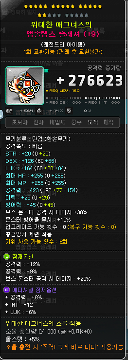 만약, 앱솔랩스 무기가 17성 이상, 잠재능력이 3줄 이상이라면 아케인셰이드보다 좋을 확률이 큽니다.