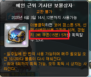 얼마 전 선데이 메이플때 뿌린 경험치 3배 쿠폰과 에인 근위 기사단 보물상자 입니다. 이런식으로 특정 기간에 얻을 수 있는 경험치 쿠폰이 있습니다. 하지만 언제 이렇게 줄 지 모르기 때문에 필요할 때 받지 못하고 필요 없을 때 받을 수도 있겠네요.