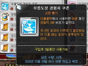 무릉도장에 도전하여 일정 상위 구간에 달성하게 되면 매주 무릉도장 포인트를 얻게 됩니다. 이 때 얻은 무릉도장 포인트로 무릉도장 경험치 쿠폰을 구입할 수 있습니다. 하지만 최근 무릉도장 패치로 인해 포인트 얻기가 이전보다 상당히 빡세졌기 때문에 이 점 참고해 주시면 좋겠습니다.