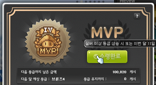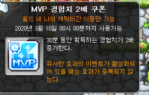 MVP 브론즈 등급 이상이라면 수령할 수 있는 mvp 보상입니다. 브론즈면 원래 1.5배 밖에 주지 않았는데 패치 이후 2배 쿠폰 2개씩 주네요. 하지만 캐시 충전을 한번도 안하신다면 mvp 2배 메이플 경험치 쿠폰은 받을 수 없겠습니다.