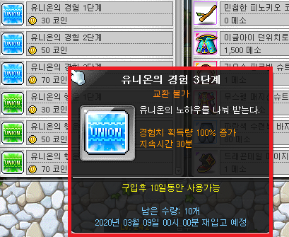 메이플 스토리에서 가장 시간을 많이 투자하는 컨텐츠가 바로 사냥이죠? 사냥을 하기 전, 경험치 2배 쿠폰이 없다면 있는 사람에 비해 같은 시간동안 사냥하는 효율이 반절로 떨어지기 때문에 사냥 전, 얻는 루트를 꼭 알아보고 준비해두시는 것이 좋습니다. 첫번째로 유니온 경험치 쿠폰입니다. 제가 가장 많이 애용하는 경험치 쿠폰인데, 유니온이 없다면 사용할 수 없기 때문에 꼭 유니온(서버 아닙니다.)을 하시는 것을 추천해 드립니다. 유니온을 시작하기 위해서는 같은 월드 내 캐릭터의 총합 레벨이 500이 넘어야 합니다. 마을마다 위치한 메이플 유니온 코인샵에서 70코인을 지불하고 일주일에 10개 씩 메이플 경험치 쿠폰을 구입할 수 있습니다.