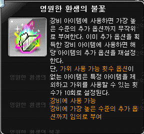 위의 아이템의 경우 DEX25 + LUK25 (3 추가 옵션) INT30 + LUK30 (2 추가 옵션) LUK27(5 추가 옵션) 이렇게 복합적으로 붙은 아이템이라고 보시면 됩니다. 따라서 강력한 환생의 불꽃으로도 상당히 좋은 추가 옵션이 나올 수 있다는 거죠. 확률은 낮지만..