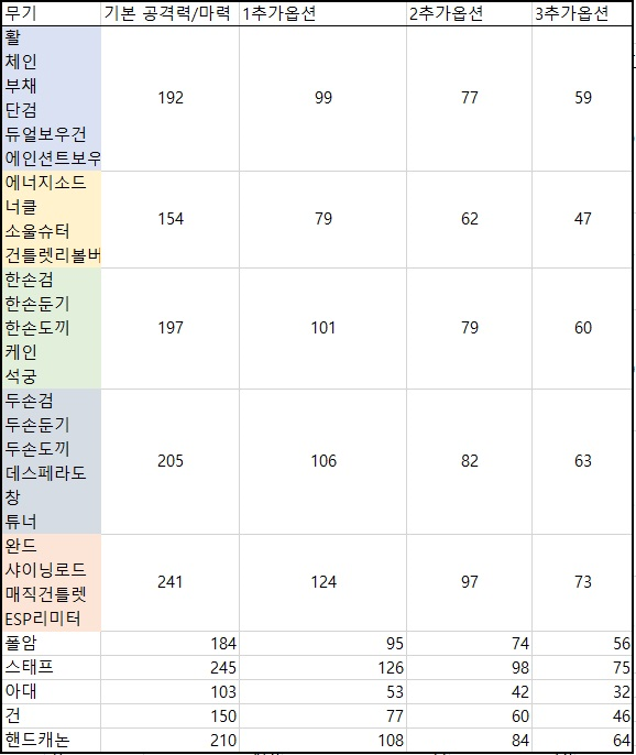 앱솔랩스 무기 아이템은 통상 2번째 추가옵션을 가장 많이 사용합니다. 22성 레전드리 아이템의 경우를 봐도 2 추옵인 경우가 많죠. 4 추옵의 아이템부터는 거의 사용하지 않기 때문에 1 추가 옵션부터 3번째 추가 옵션까지 정리해 드렸습니다. 위의 표를 보시면 기본 공격력/마력에 추가 옵션이 더해지는 것입니다.