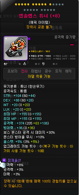 예를 들어, 사진의 앱솔랩스 튜너의 경우 기본 공격력 205+82로, 추가옵션이 82인 것을 확인할 수 있습니다. 바로 2추옵이죠. 즉, 추가옵션은 INT15, LUK15, 공격력82, 마력31, 올스탯6%가 붙었습니다. 오른쪽 튜너 아이템처럼 업그레이드 및 스타포스를 하게 되면 추가로 공격력이 붙게 되는데요 이럴때도 추가옵션을 보는 방법은 동일합니다. 하얀색 기본 공력력 205 + 노란색 추가옵션 +63 파란색 스타포스 및 주문의 흔적으로 업그레이드 된 공격력 106입니다. 여기서 보셔야 할 것은 바로 노란색 추가옵션 63 입니다. 3번째 추옵이네요. 다른 아이템도 마찬가지의 방법으로 보시면 되겠습니다.